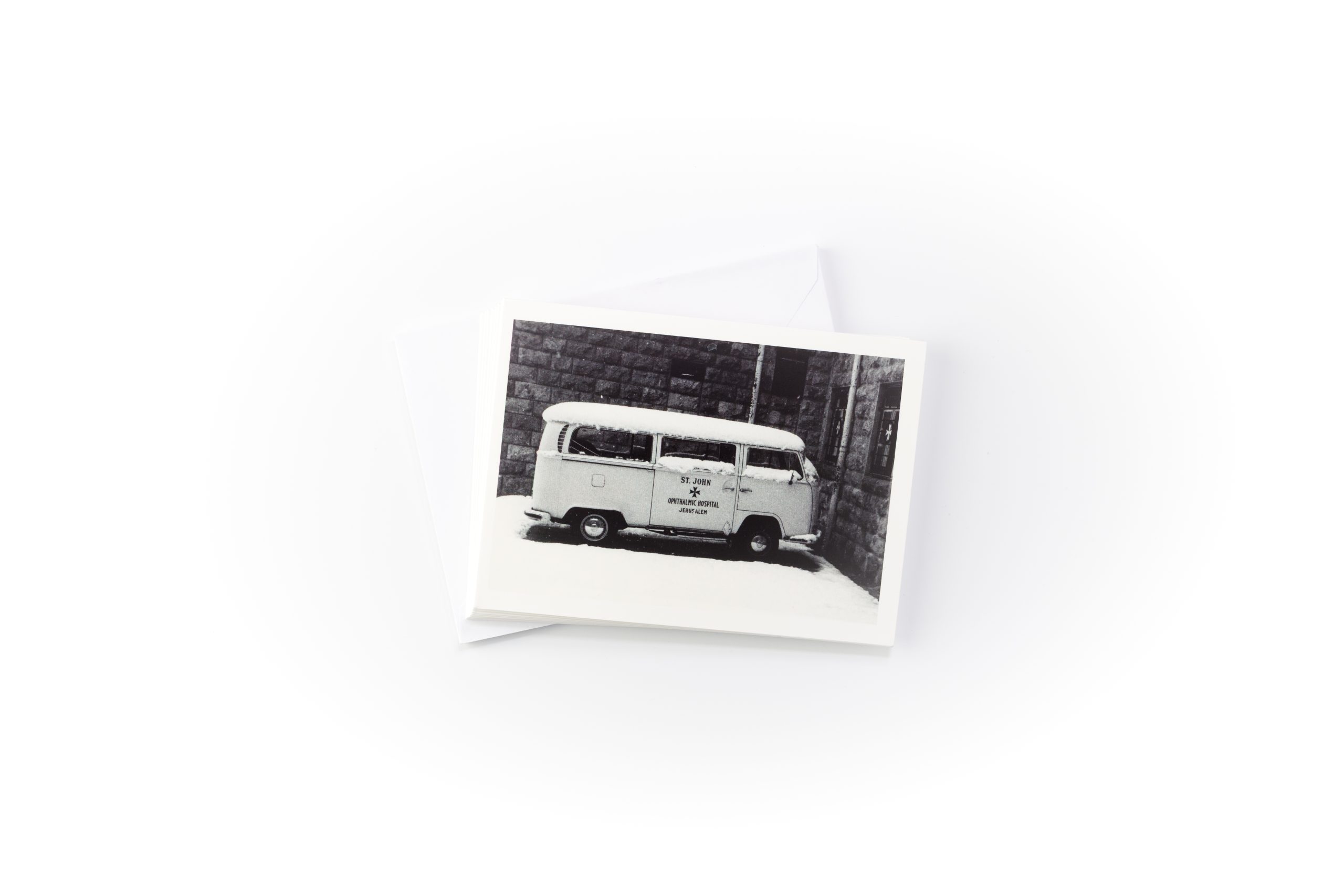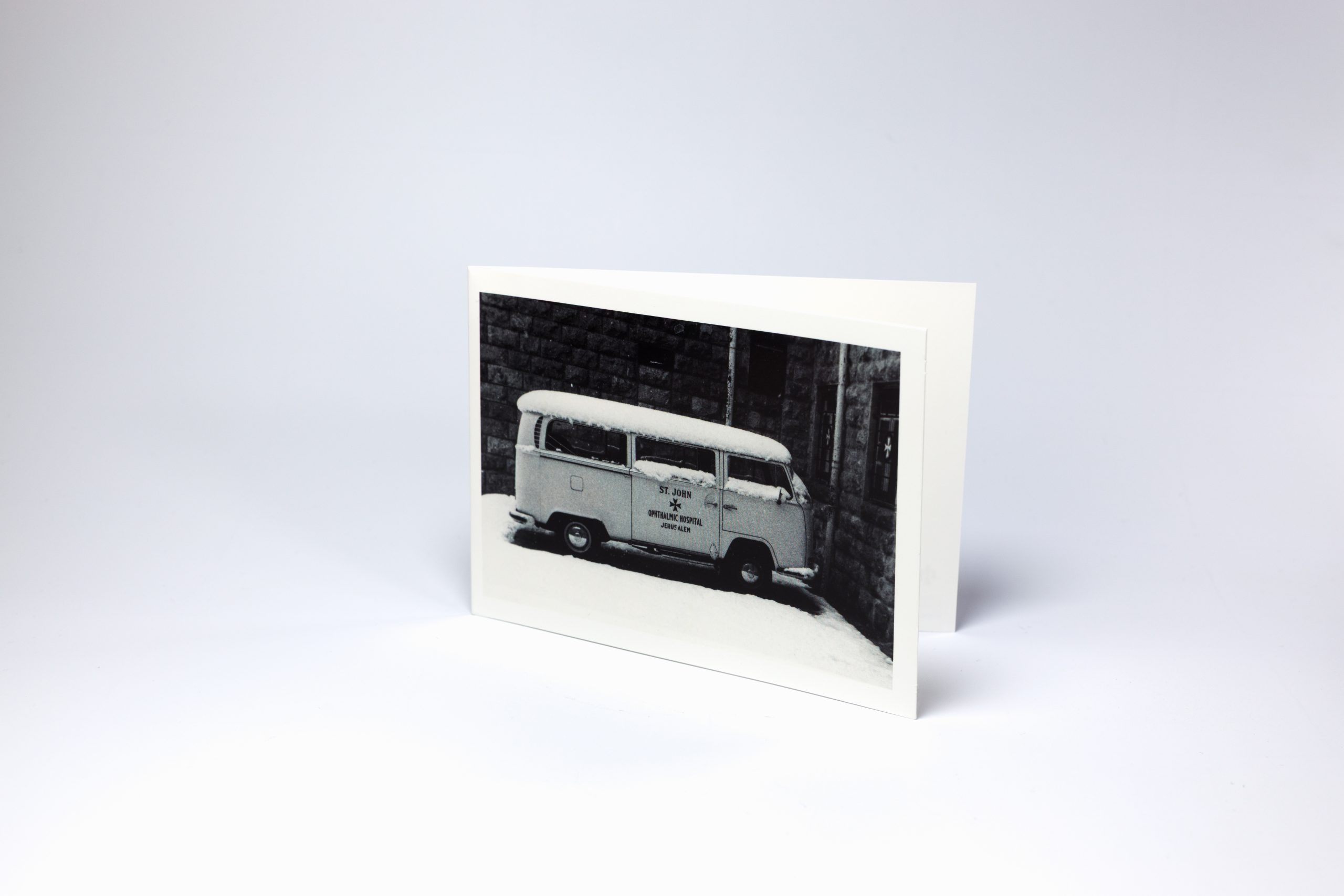 Christmas Cards featuring a photo of our original 1980 Mobile Outreach Van in the snow – Pack of 10. Blank inside for own message.